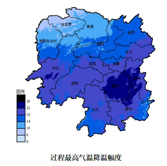 一是降温剧烈。全省日最高气温平均下降18.3℃,澧县、临澧、石门等67个县市区最高气温降幅超过20℃,怀化市洪江市降幅最大达24.0℃,101个县市区达到寒潮标准。