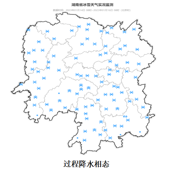 三是雨雪相态复杂。13日至14日中午以降雨为主,14日下午湘北开始转雨夹雪或雪,14日晚至15日出现大范围雨夹雪或雪,其中湘北局地中到大雪,最大为慈利降雪量达7.9毫米;同时慈利、岳麓区、新宁、郴州市区、资兴、桂阳、汝城、临武8个县市区出现0~1毫米轻冰冻。