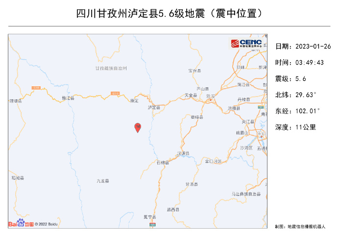1月26日3时49分,四川甘孜州泸定县(北纬29.63度,东经102.01度)发生5.6级地震,震源深度11千米。