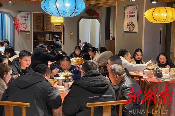 大年初四中午,衡东县的昇汇缘酒店,门口热闹喜庆,店内座无虚席。店主曾建设忙着接待进进出出的客人。“春节假期,客流量大了许多。仅大年初二这天,营业额就有6万多元。”曾建设说。