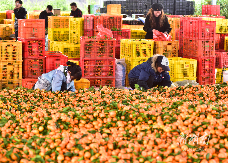 1月18日,嘉禾县珠泉镇沙坪村,果农在分拣砂糖橘。春节前夕,该村生态农业园的400多亩砂糖橘丰收成熟,果农们加班加点采摘、分拣、装运,进行线上线下销售,供应春节市场。黄春涛 摄(一审:马俊达 二审:王立三 三审:刘建光)