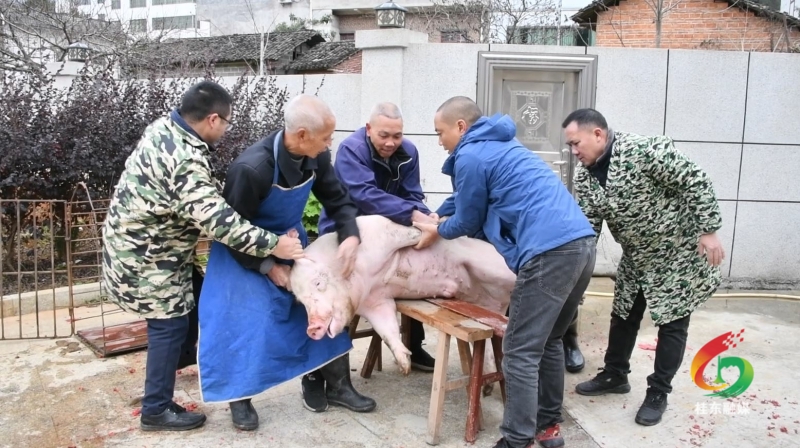 准备工作完成后,大家齐心协力将年猪抬上杀猪架,杀猪、烫猪毛、刮猪毛,不一会儿工夫,便将猪身刮得干干净净;紧接着大家将年猪倒挂在架子上,开始对猪进行处理,手法娴熟,行云流水,整只年猪很快被分成一块块,然后用浸湿的稻草捆绑起来放进一旁的篓子里,其中一部分用于赠送给前来帮忙的亲朋好友。