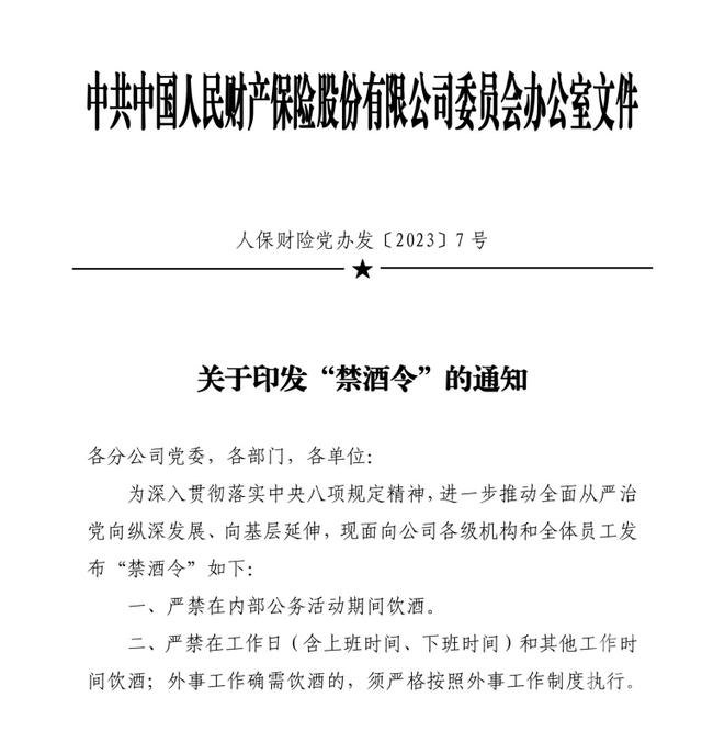 记者注意到,这份“禁酒令”通知是中国人民财产保险股份有限公司委员会办公室1月31日发布《关于印发“禁酒令”的通知》,该《通知》称,为深入贯彻落实中央八项规定精神,进一步推动全面从严治党向纵深发展、向基层延伸,现面向公司各级机构和全体员工发布“禁酒令”,包括:一、严禁在内部公务活动期间饮酒。二、严禁在工作日 ( 含上班时间、下班时间 ) 和其他工作时间饮酒:外事工作确需饮酒的,须严格按照外事工作制度执行。三、严禁违规使用公款宴请和饮酒。四、严禁参加可能影响公正执行公务的宴请和饮酒。五、严禁在任何时间、任何地点、任何场合酗酒。六、严禁酒后驾车、寻衅滋事等违法行为。
