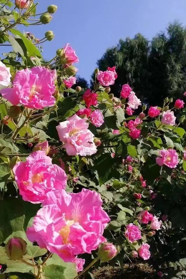 其实,我更喜欢木芙蓉。在浏阳河畔风光带、在乡村的沟渠边、在居民小区庭院里,还有在喜庆的广场和公园里,那一族族的木芙蓉,叶子浅绿清澈、繁多茂密地长在枝丫上,纯洁脱俗、端庄秀美,远看真像是一群打扮入时的窈窕少女在窃窃私语。
