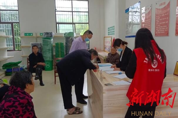 ▲2022年10月,华容县万庾镇双杨村村委会工作人员向群众耐心解释“一卡通”相关政策