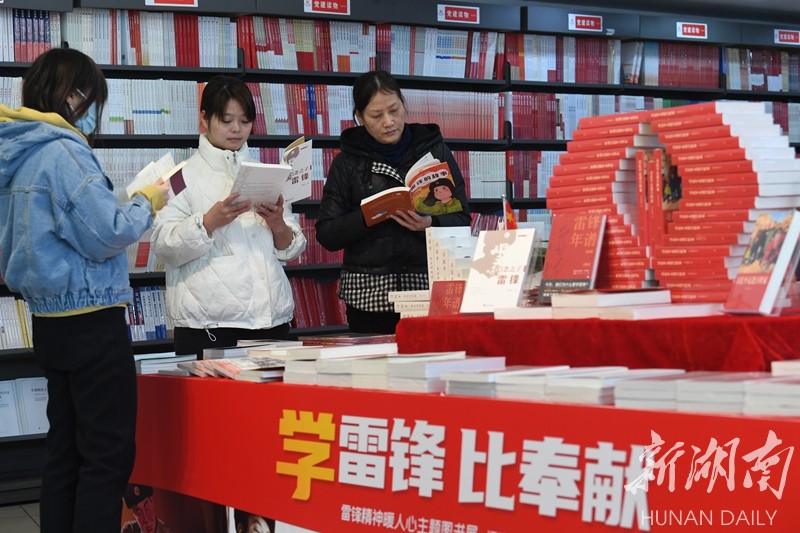 2月27日,长沙市芙蓉区湖南图书城,读者在雷锋故事书籍专柜前阅读。当天,湖南省新华书店设立雷锋故事书籍专柜,并张贴“学雷锋 比奉献”系列宣传海报,传扬雷锋精神。湖南日报全媒体记者 徐行 通讯员 唐婧 摄影报道