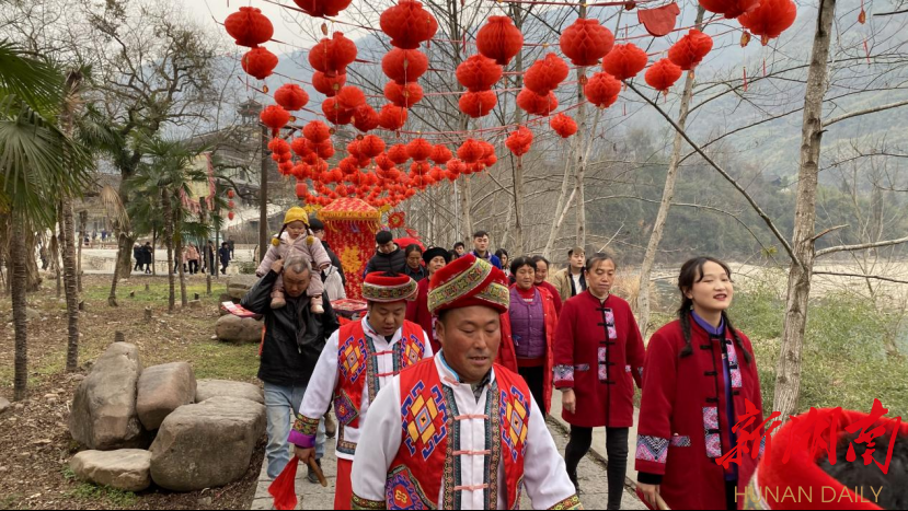 锣鼓喧天,唢呐高亢;张灯结彩,喜气洋洋。2月6日,元宵佳节浓郁的喜庆味道还未散去,湘西土家族苗族自治州龙山县惹巴拉景区核心景点惹巴拉王宫里又因新春里第一场土家族“传统花嫁”变得热闹非凡。