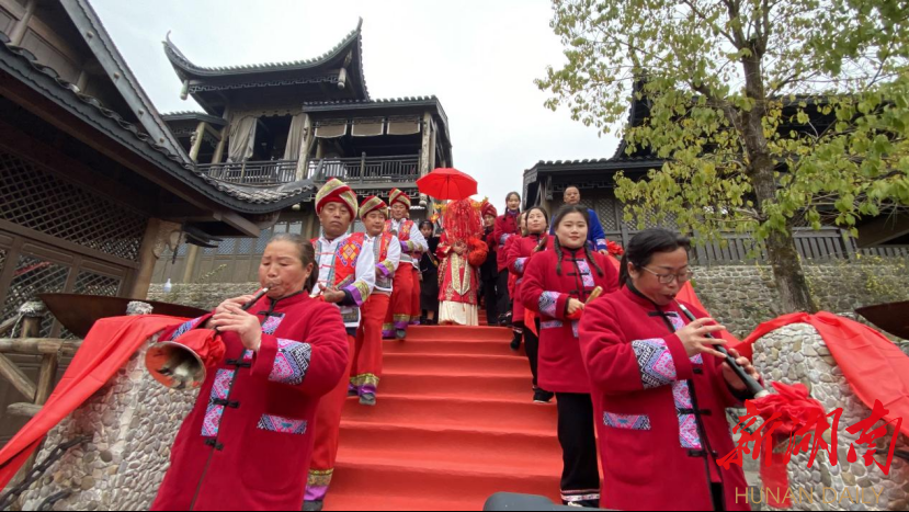 当天上午8时许,一支背背篓、挑箩筐、抬花轿的浩荡迎亲队伍,在土家族传统乐队欢快喜庆的敲打吹奏声中,从惹巴拉王宫码头沿着红地毯拾阶而上,到达月亮门。