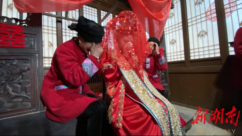 与此同时,王宫的公主楼的闺房里哭嫁歌悠长、动情。在土家族传统婚嫁特殊习俗——哭嫁里,新娘与亲人们挥泪诉衷肠,感念养育恩、手足情,道出千万般不舍的离别之情和对未来美好的向往。最终,在迎亲队伍千呼万唤和围观群众的翘首以待中,新娘由自己的弟弟从闺房中背上了花轿。