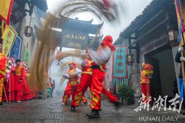 正月初一,洪江古商城各大会馆龙狮队伍在“半个铜钱”剧场进行 “请龙”“点睛”仪式,祈祷新年风调雨顺、五谷丰登,并在古城踏街巡游,数万游客和市民追逐围观,“摸龙头”“扯龙须”“拱龙身”,欣赏龙狮表演、看彩龙船,以洪江人独有的方式祈福春节。正月初二,洪江古商城举办湖南省第二届潇湘舞龙大会,各路队伍同台竞技,角逐最佳“驯龙高手”,为“洪福洪江年”增添浓浓的传统年味。