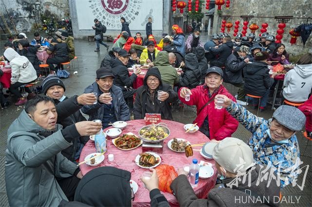 春节期间,洪江古商城大街小巷弥漫浓郁年味,具有洪江特色的宴席在洪江古商城留园摆开,与洪江古商城窨子屋融为一体,游客们纷纷加入百家宴,参与打糍粑活动,与当地居民品尝洪江美食,共享洪江年味。