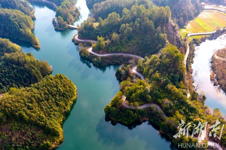 2023年1月3日,冬日的通道侗族自治县玉带河国家湿地公园,在蓝天映衬下,植被、公路和湖水交相辉映,犹如一幅梦幻的水墨画卷。近年来,该县实施玉带河国家湿地公园水土流失综合治理,持续开展水库、河流水源地生态环境保护,厚植生态家底,筑牢生态屏障。(李尚引 摄)