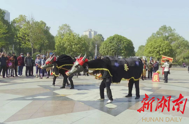 冷水江市积极开展群众参与、群众欢迎、群众受益的文体活动,并将乡村文化的根基紧紧地扎在乡村振兴的肥沃泥土中。1月31日,由两面太平锣与两面龙旗开道,多达30余人的舞春牛队在沙塘湾街道上排成长龙。队员手持花灯彩旗,敲响梅山传统鼓乐,两头憨态可掬的春牛冲出,表演“舞动春潮”、“勤牛奋蹄”、“怒移泰山”、“犀牛望月”、“人牛共舞”等形态,演绎稻作文化,体现出丰收的喜悦情怀,表达新年风调雨顺,国泰民安的美好愿景。
