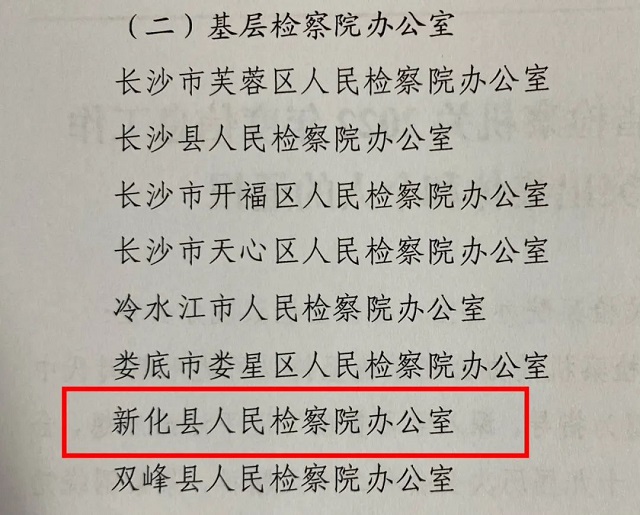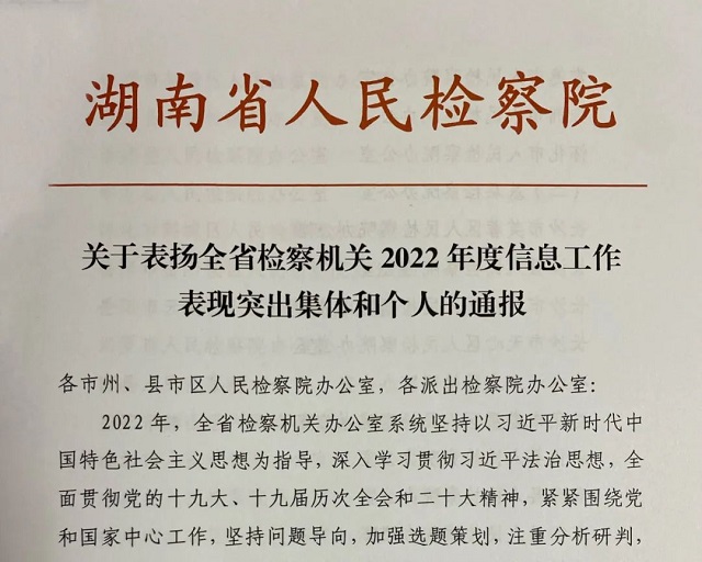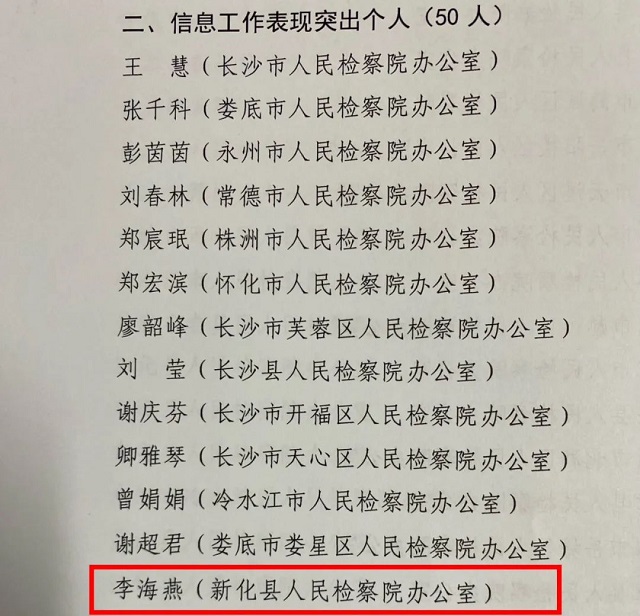 近日,湖南省人民检察院对全省检察机关2022年度信息工作表现突出集体和个人进行了通报,新化县人民检察院办公室被评为“信息工作表现突出集体”,办公室干警李海燕被评为“信息工作表现突出个人”。