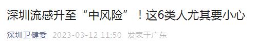 据深圳卫健委3月12日消息,深圳市疾病风险综合预报结果显示,当前深圳流感的风险等级为“中”。