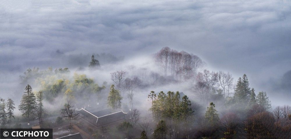 ↑2023年2月12日,雨后的安徽省黄山市休宁县里庄村云雾缭绕。(无人机照片)CICPHOTO/王运选 摄