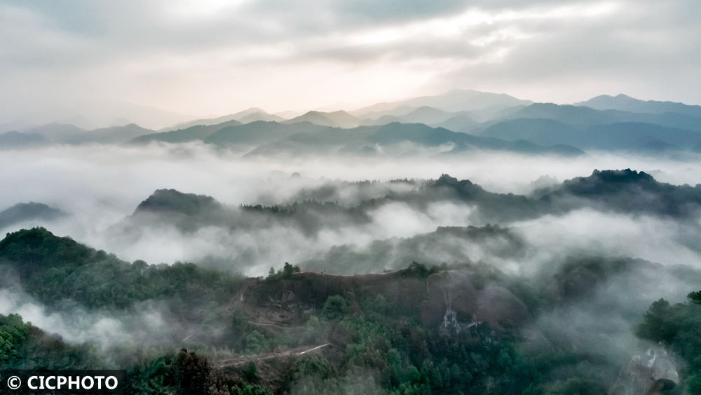 ↑2023年3月4日在江西省萍乡市湘东区东桥镇厚田村拍摄的云雾缭绕的老虎山。(无人机照片)CICPHOTO/李桂东 摄