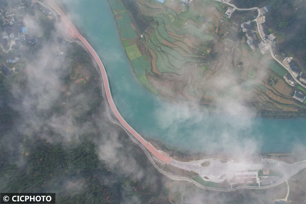 ↑2023年2月26日拍摄的晨雾中的贵州省铜仁市江口县双江街道齐心村。(无人机照片)CICPHOTO/李鹤 摄
