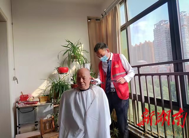 志愿者、理发师袁涛也没闲着。得知社区居民孙鹏翔、喻吉秀夫妻二人年事已高,出行不便,他便带着理发工具,穿上红马甲,义务上门理发。