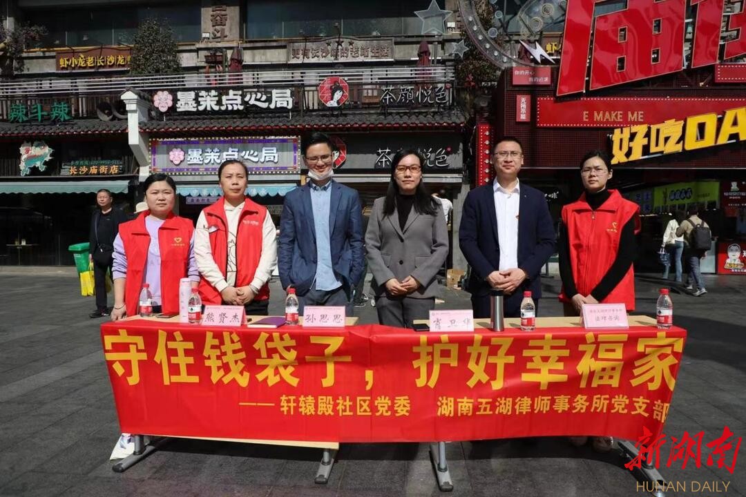 新湖南客户端3月16日讯(通讯员 蹇尚慧)为提高辖区居民群众的识骗、防骗能力,3月15日,长沙市开福区通泰街街道轩辕殿社区党委联合湖南五湖律师事务所党支部开展“守住钱袋子 护好幸福家”宣传活动。