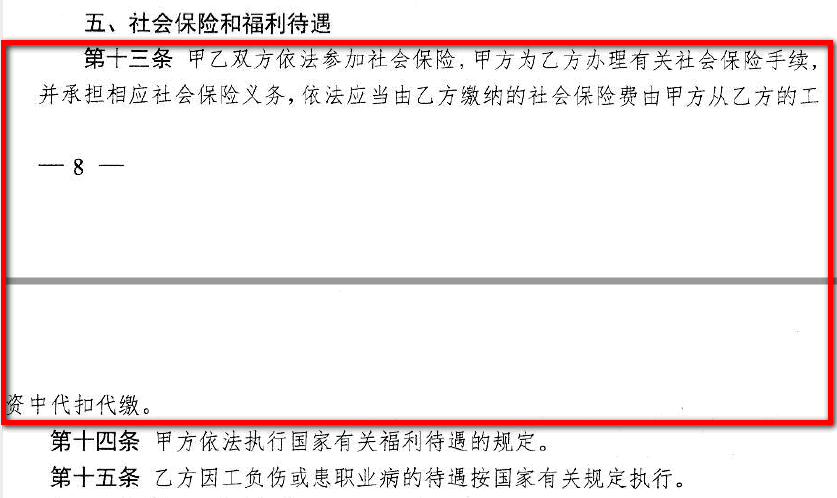 《新就业形态劳动者劳动合同参考文本》第十三条规定,甲乙双方依法参加社会保险,甲方为乙方办理有关社会保险手续,并承担相应社会保险义务,依法应当为乙方缴纳的社会保险费由甲方从乙方的工资中代扣代缴。
