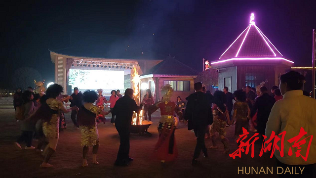 随后,游客们观看了具有深郁地方特色的非遗表演新化山歌《敬茶歌》《砍柴舞》《梅山武术》等,生动展现了蚩尤故里、梅山文化的优美画卷和崇文尚武、厚德重义的新化精神,令观众们欢呼不断、掌声连连。随后,大家围着篝火跳起了欢快的舞蹈,在欢声笑语中度过难忘的夜晚……
