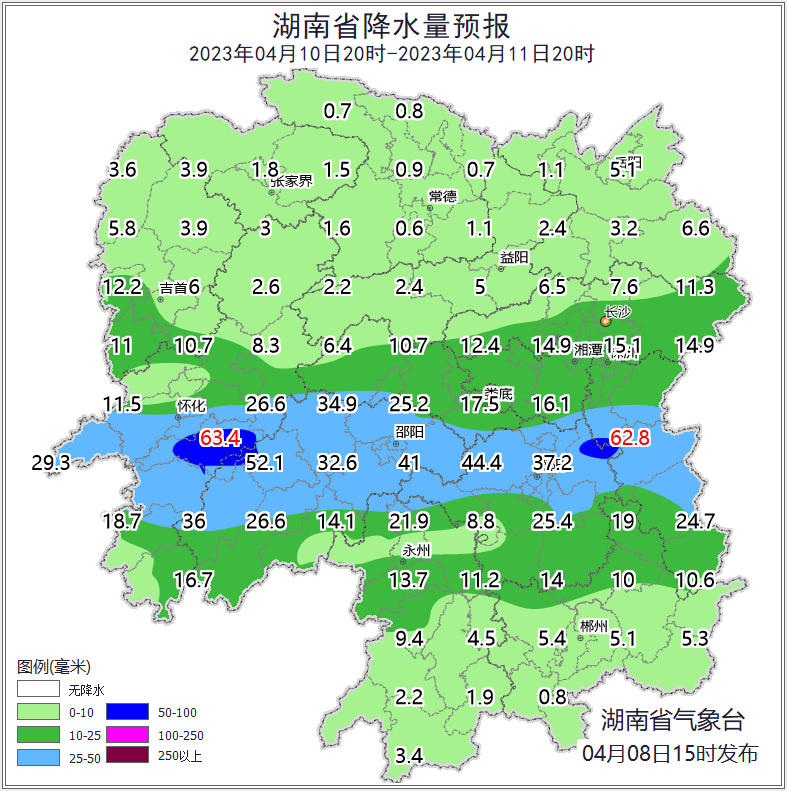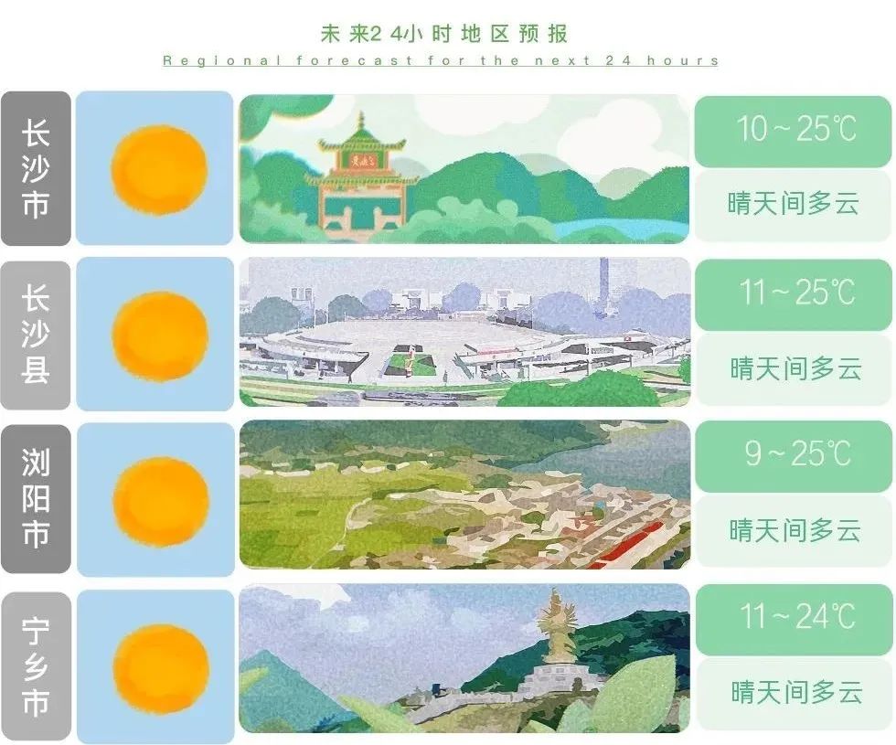 8日20时至9日20时,怀化南部、邵阳西部、永州南部多云有阵雨,其他地区晴天间多云,湘西北局地早晨有雾;南风2~3级;最高气温23~25℃;最低气温湘西9~11℃,其他地区11~13℃。9日20时至10日20时,张家界、常德、益阳北部、岳阳多云转阴天,其他地区多云转阴天有阵雨;南风2~3级;最高气温24~26℃;最低气温湘西13~15℃,其他地区15~17℃。