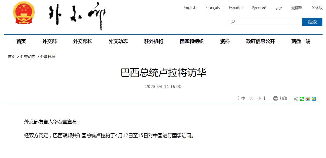 经双方商定,巴西联邦共和国总统卢拉将于4月12日至15日对中国进行国事访问。