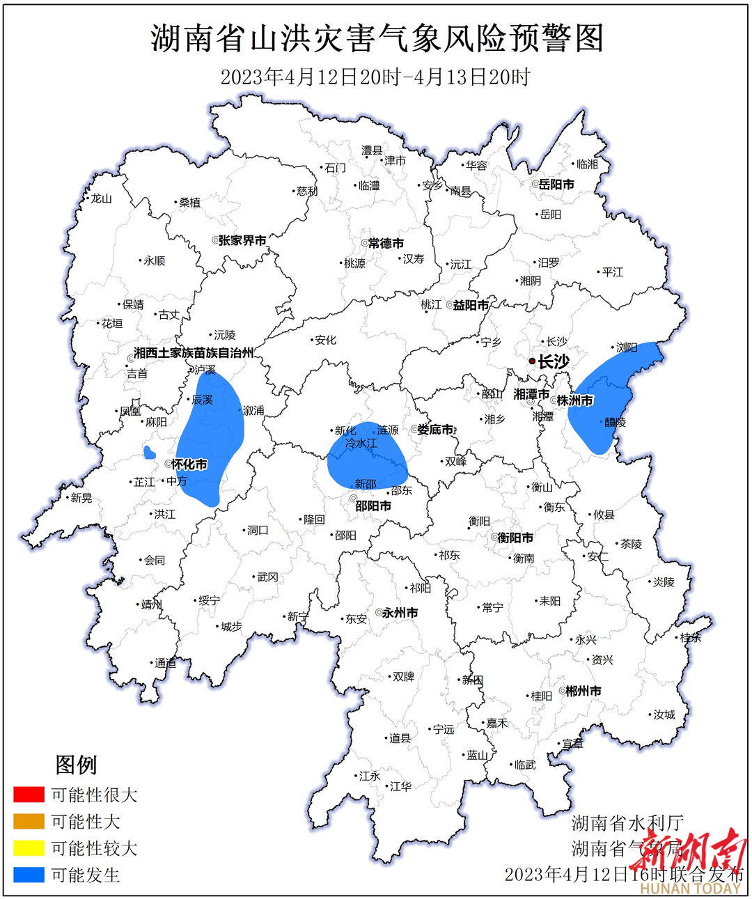 湖南日报4月12日讯(全媒体记者 奉永成)今天,省水利厅与省气象局联合会商决定启动山洪灾害蓝色预警。受降雨影响,自4月12日 20:00至4月13日 20:00,怀化市北部、邵阳市北部、娄底市南部、株洲市东北部、长沙市东南部等局地可能发生山洪灾害(蓝色预警)。