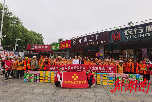 湖南日报·新湖南客户端4月22日讯(通讯员 王星萍)4月20日,在五一劳动节即将来临之际,怀化市总工会、怀化市志愿者协会携手蔡徐坤妈妈团在市委佳惠广场开展“蔡徐坤粉丝致敬辛勤劳动者”活动,为环卫工人送上100箱果茶。