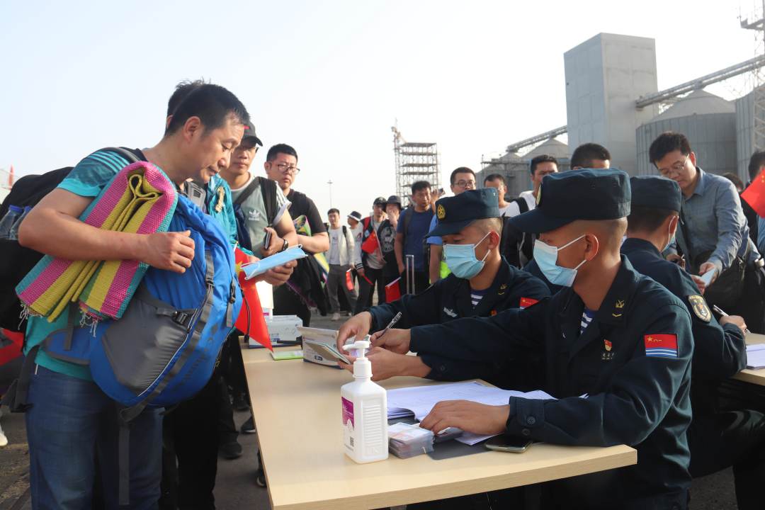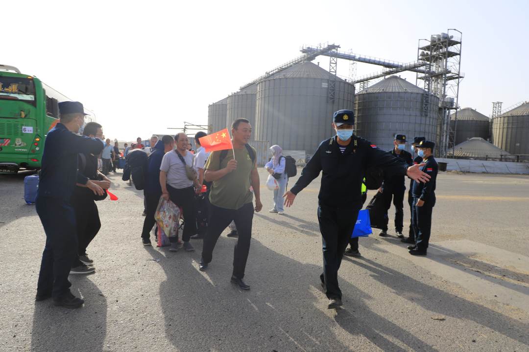 在官兵们期待的目光中,当地时间16时40分许,搭载首批撤离人员的大巴车队拖着扬起的尘土安全抵达码头。“亲爱的同胞们,大家辛苦了!请大家放心,我们来了,大家安全了!”编队指挥员的亲切问候让连日奔波的撤离人员感受到了久违的安宁。