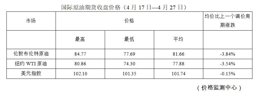 根据国家发改委消息,新一轮成品油调价窗口将于今天(4月28日)24时开启。国家发改委价格监测中心监测,本轮成品油调价周期内(4月17日—4月27日)国际油价下降。平均来看,伦敦布伦特、纽约WTI油价比上轮调价周期下降3.69%。