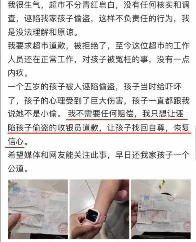 河北保定,曾发生这样一件令人气愤的事。王女士带着5岁女儿一起去超市购物,结账完准备离开时,超市的防盗报警器响个不停。这时,超市工作人员立刻拦下母女俩,不分青红皂白就开始搜身,没有任何发现。这时,超市经理过来说,女孩带的手表和超市的一模一样,怀疑女孩偷窃。王女士解释,孩子手上的表已经买了很久了,而且也不是这家超市买的。为了证明清白,王女士还特地回家拿来了发票,事后也证实超市根本不卖这款手表。很明显,孩子被诬陷了,肯定得要个道歉。没想到,超市不仅拒绝了,态度还十分蛮横: