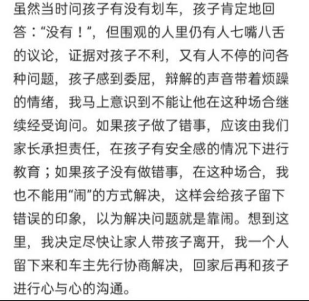 第二,好好沟通,无论他犯错与否回家之后,刘涛没有大发脾气,而是心平气和地了解事情经过,见儿子依然坚称自己没有划车,他选择了无条件信任。第三,为还孩子清白,不怕麻烦确认儿子没有划车后,爸爸再次找到邹警官沟通此事。
