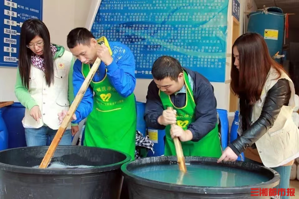 (在长沙市开福区博爱阳光家园残疾人托养机构,“喜憨儿”们正在志愿者的指导下制作洗洁精。通讯员供图)