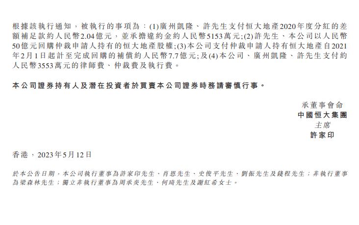 公告显示,根据该执行通知,被执行的事项为:(1)广州凯隆、许家印支付恒大地产2020年度分红的差额补足款约人民币2.04亿元,并承担违约金约人民币5153万元;(2)许家印、公司以人民币50亿元回购仲裁申请人持有的恒大地产股权;(3)公司支付仲裁申请人持有恒大地产自2021年2月1日起计至完成回购的补偿约人民币7.7亿元;及(4)公司、广州凯隆、许家印支付约人民币3553万元的律师费、仲裁费及执行费。