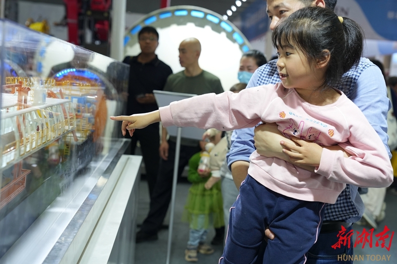 5月13日,长沙国际会展中心,小朋友被展区里的机械模型吸引。