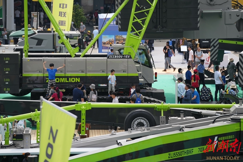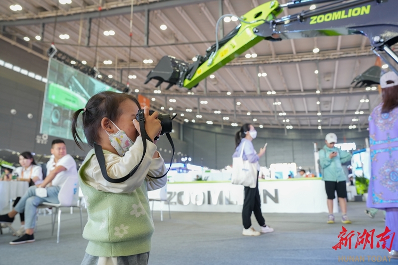 5月13日,长沙国际会展中心,小朋友拿着相机拍摄工程机械。