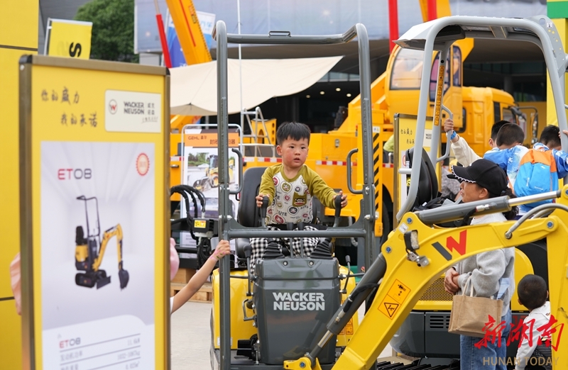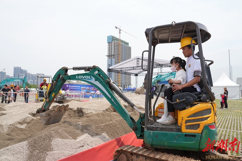 5月13日,长沙国际会展中心,小朋友在表演区上手体验小型挖掘机的操作乐趣。