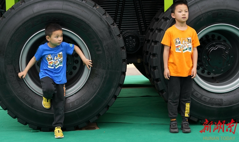5月13日,长沙国际会展中心,小朋友和大型工程机械轮胎比“身高”。当天正值周末,不少父母带着自家萌娃来到第三届长沙国际工程机械展览会,实地感受大型工程机械的魅力。湖南日报全媒体记者 辜鹏博 摄