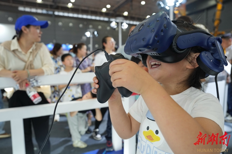 5月13日,长沙国际会展中心,小朋友在铁建重工展区体验VR操控工程机械的乐趣。