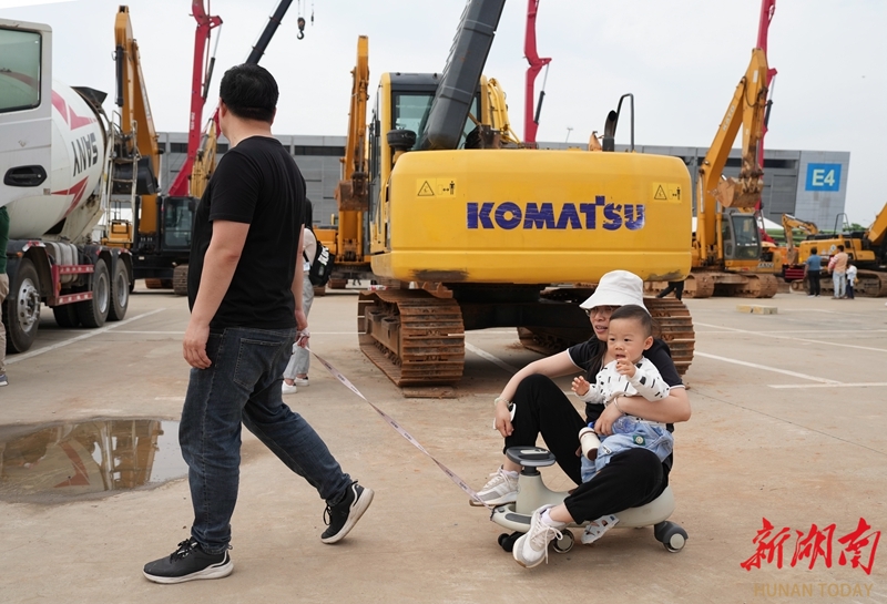 5月13日,长沙国际会展中心,小朋友和妈妈坐在“小车”上观看工程机械展览会。