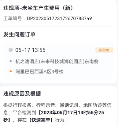 此外,王女士向记者出示了自己被网约车平台扣分的截图。截图显示,网约车平台判定其“存在快速完单行为”,王女士因此被扣减服务分20分,王女士表示,自己申诉“已经报备过了”被驳回。她希望平台可以撤销此次处罚,“扣减20分是很高的处罚了。”