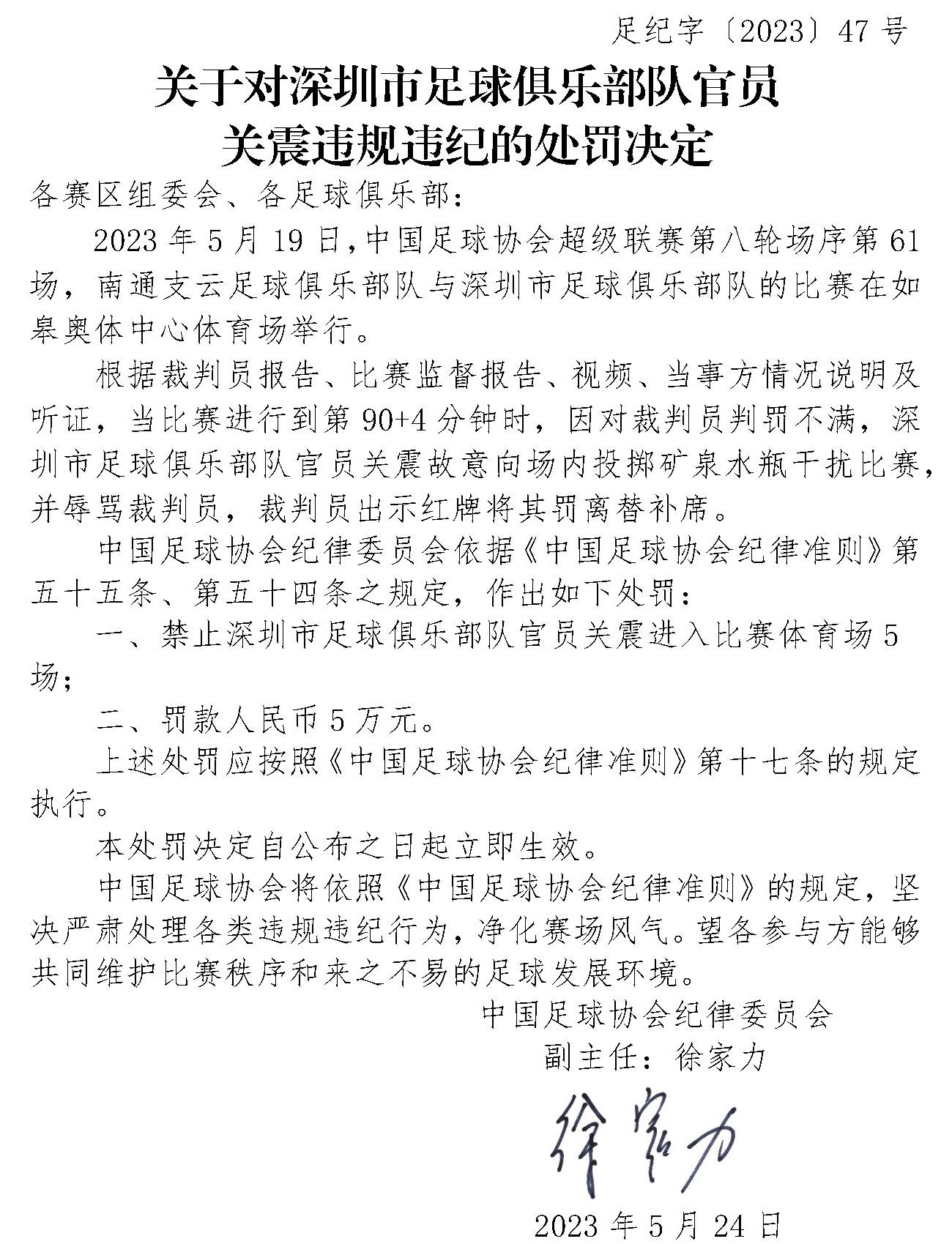 继昨天(5月23日)对山东泰山足球俱乐部队球员贾德松、武汉三镇足球俱乐部队球员阿齐兹违规违纪的处罚后,中国足协今天再开出两张罚单,禁止武汉江城足球俱乐部队官员艾志波进入比赛体育场5场,并罚款人民币2.5万元。禁止深圳市足球俱乐部队官员关震进入比赛体育场5场,并罚款人民币5万元。