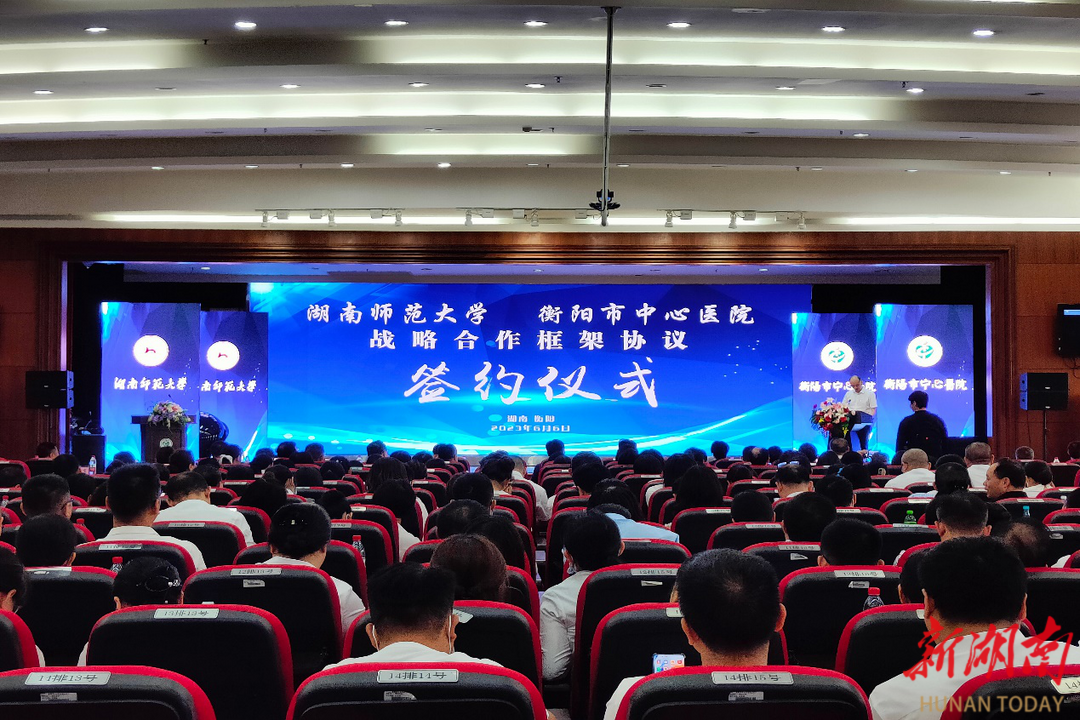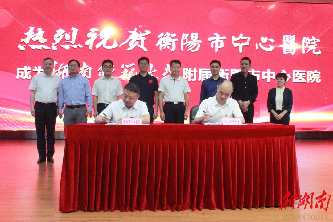 大众卫生报·新湖南客户端6月7日讯(通讯员 殷君发)6月6日,湖南师范大学与衡阳市中心医院共建湖南师范大学附属衡阳市中心医院签约仪式在衡阳市中心医院雁峰院区举行。湖南师范大学党委委员、副校长杨震,发展规划与学科建设处处长孙岳兵、医院管理办公室副主任周国强、医学院院长何祖平、党委书记鄢朝晖、副院长李玉飞、院长助理李专,衡阳市政协副主席许云生,湖南省卫生健康委医政医管处处长陈鸿君出席签约仪式,衡阳市卫生健康委党组副书记、副主任邹建军出席并主持签约仪式,衡阳市中心医院主要领导及相关负责人参加会议。