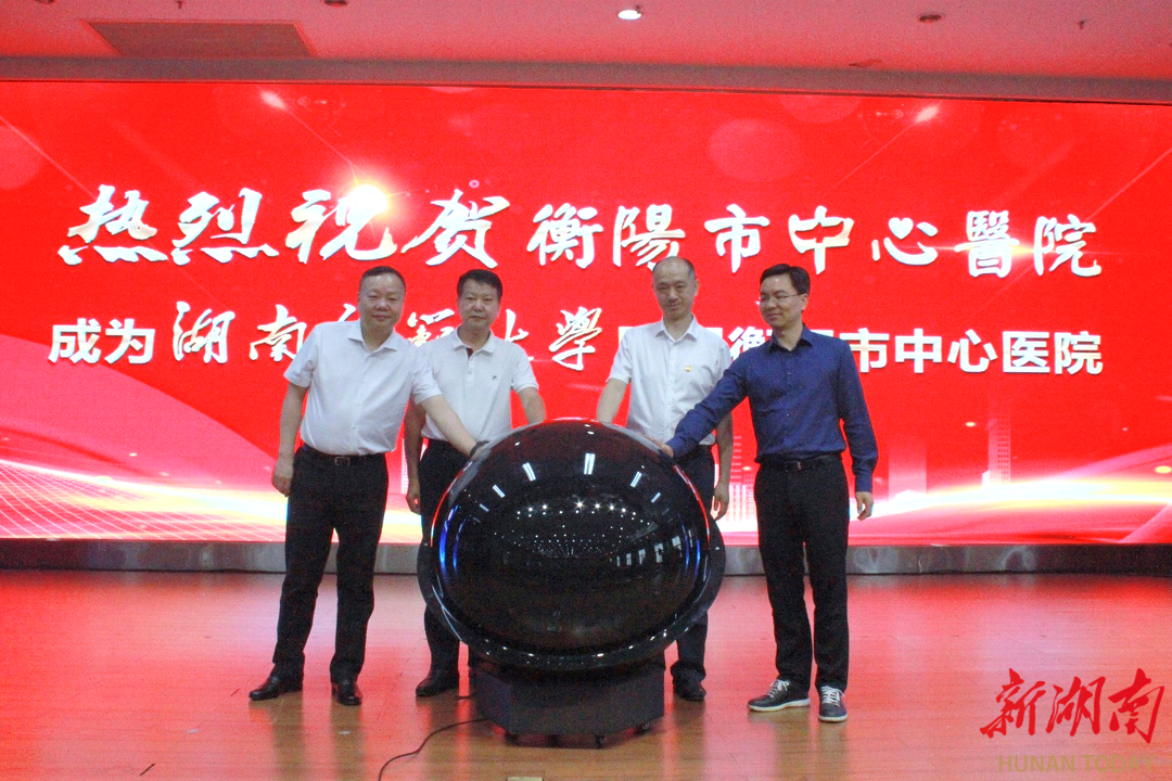 会上,湖南师范大学副校长杨震与衡阳市中心医院院长尹军共同签署《湖南师范大学 衡阳市中心医院战略合作框架协议》,杨震代表湖南师范大学授牌,尹军代表衡阳市中心医院接牌。出席会议领导在见证签约之后,共同点亮启动球,宣告湖南师范大学附属衡阳市中心医院正式起航。