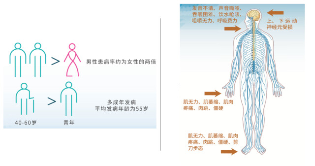 渐冻症学名叫肌萎缩侧索硬化(ALS),是一组以上、下运动神经元损害为突出表现的慢性进行性神经系统变性疾病。常见症状表现为一侧或双侧手指活动笨拙、无力、肌肉萎缩,随着病程的延长,肌无力和萎缩扩展至躯干和颈部,也可累及面肌和咽喉肌。受累部位可伴有明显肌束颤动,也就是我们常说的“肉跳”。