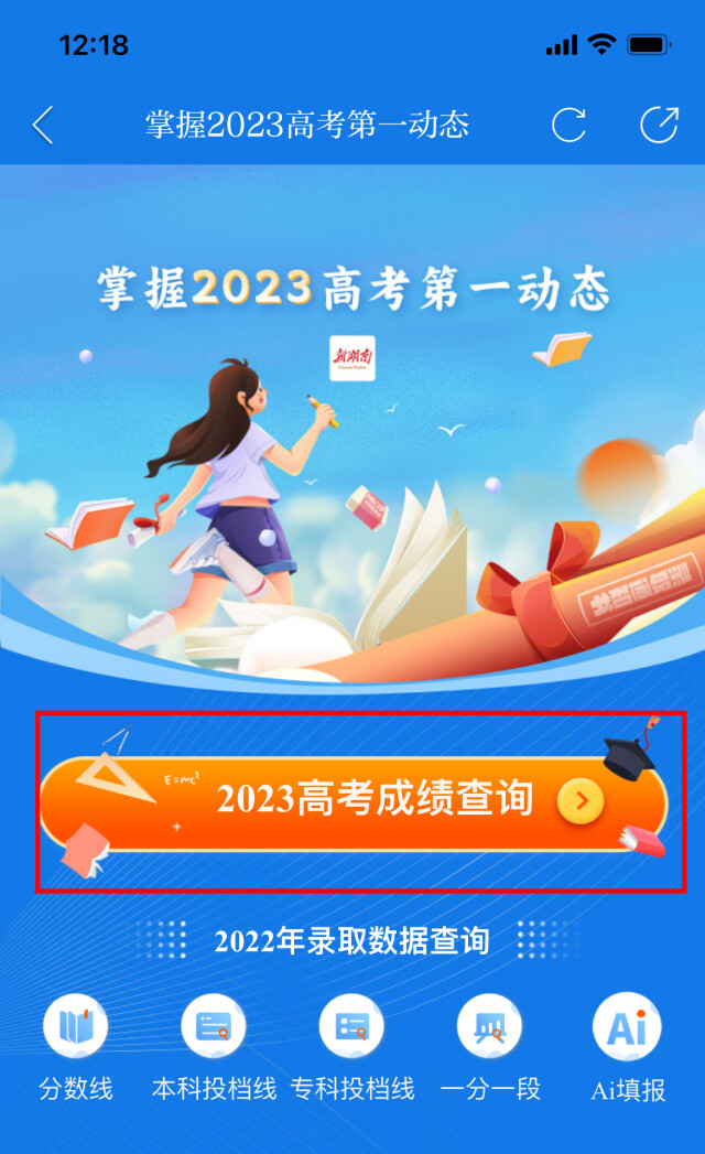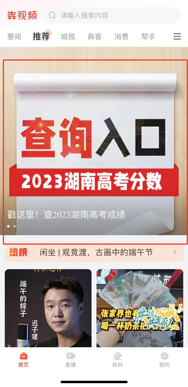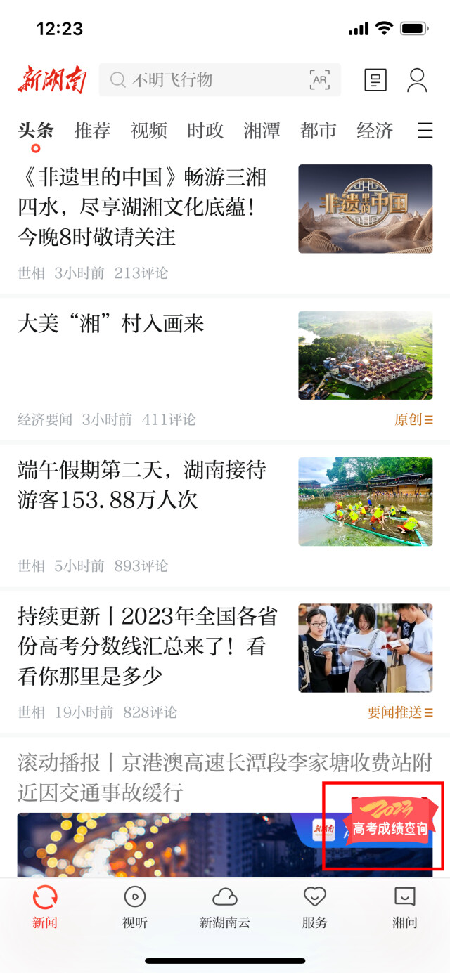 2、打开新湖南APP首页,并点击进入首页右下角“高考成绩查询”浮窗入口;