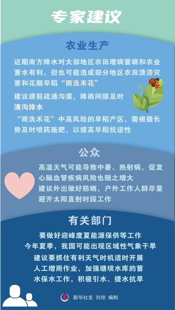 对农业生产而言,近期南方降水对大部地区农田增墒蓄墒和农业蓄水有利,但也可能造成部分地区农田渍涝灾害和花期早稻“雨洗禾花”。专家建议提前疏通沟渠,降雨间隙及时清沟排水;“雨洗禾花”中高风险的早稻产区,需根据长势及时喷药施肥,以提高早稻抗逆性。