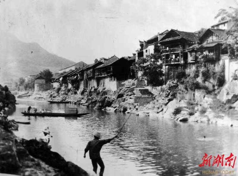 说来也巧,黄老的表叔沈从文1982年最后一次回湘西时,也来到了舅妈亲戚家旁边的东正街码头,并与夫人张兆和一起坐在码头边的石头上,留下了一张珍贵的历史照片,望着在峒河两岸间往返的拉拉渡,让他思绪万千……